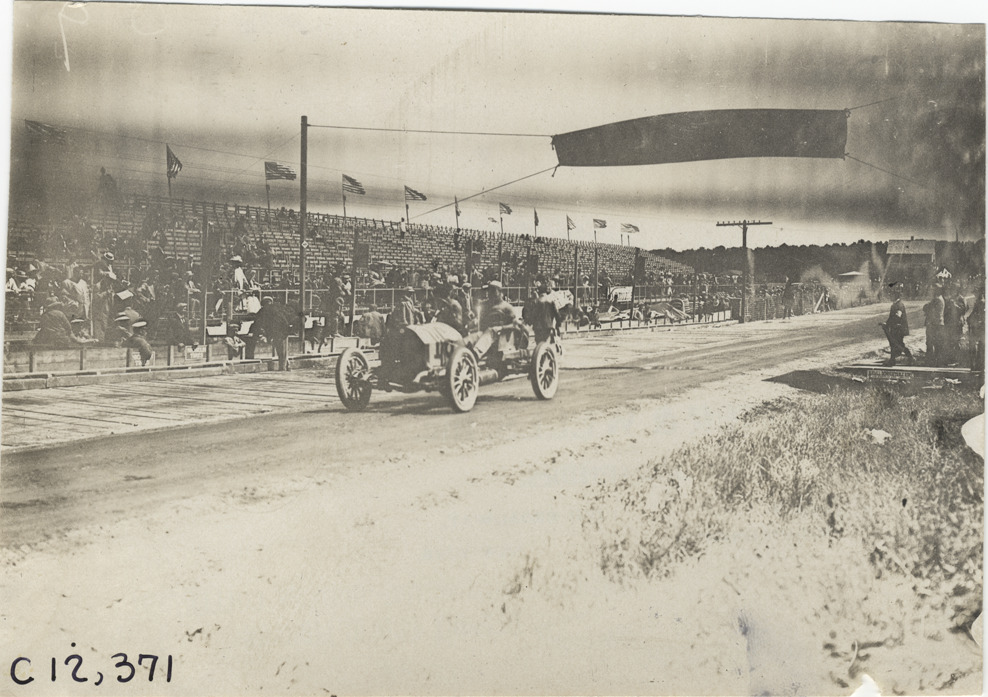 Racecar under "Start-Finish" banner, 1909 Crown Point races