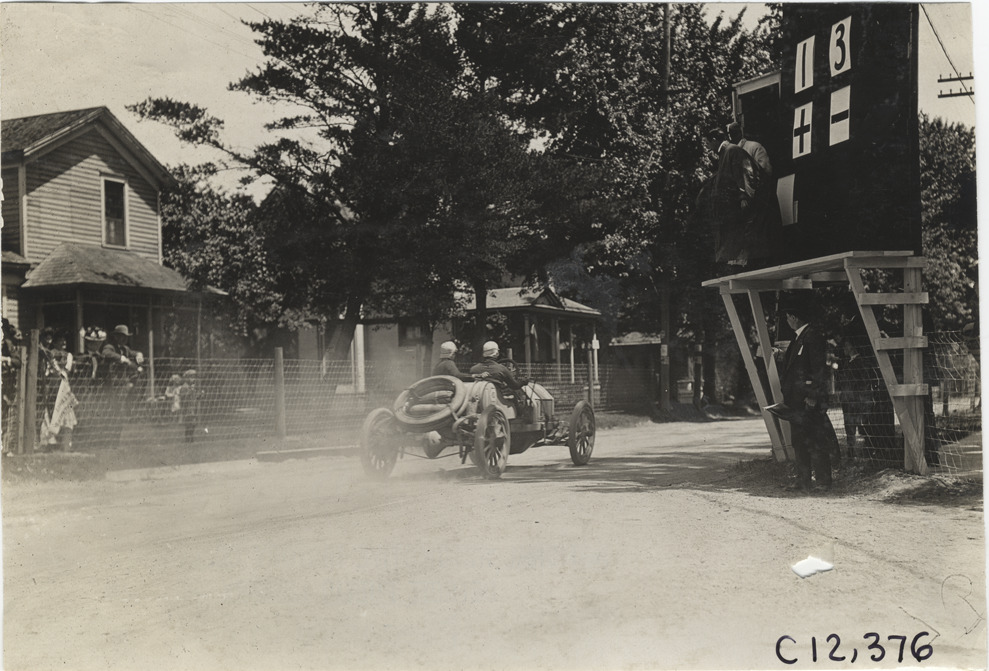 Racecar passing scoreboard, 1909 Crown Point races