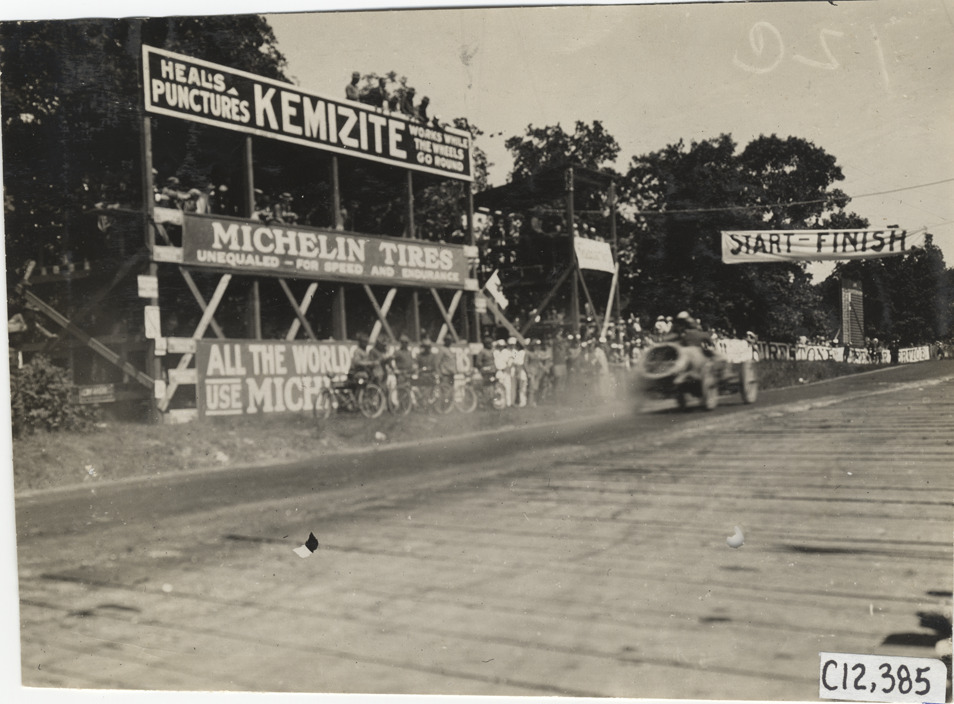 Racecar approaching finish line, 1909 Crown Point races