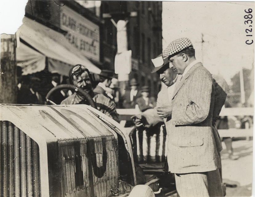 View of Louis Chevrolet in Buick car no. 10 during the 1909 Crown Point races in Indiana. Two men, possibly journalists, stand next to car. Stamped on back: "Spooner & Wells, Inc., photographers, telephones 3472-3473 Columbus, 1931 Broadway, New York." Handwritten on back: "Chevrolet, Cobe. Crown Point. Races and racing--Crown Point races, 1909."