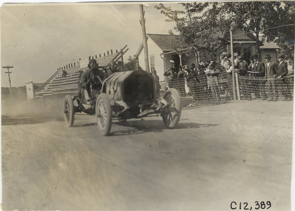 View of driver and passenger racing car no. 10 on course during the 1909 Crown Point races in Indiana. Bleachers, spectators and wooden-frame house in background. Handwritten on back: "Races and racing--Crown Point races, 1909."