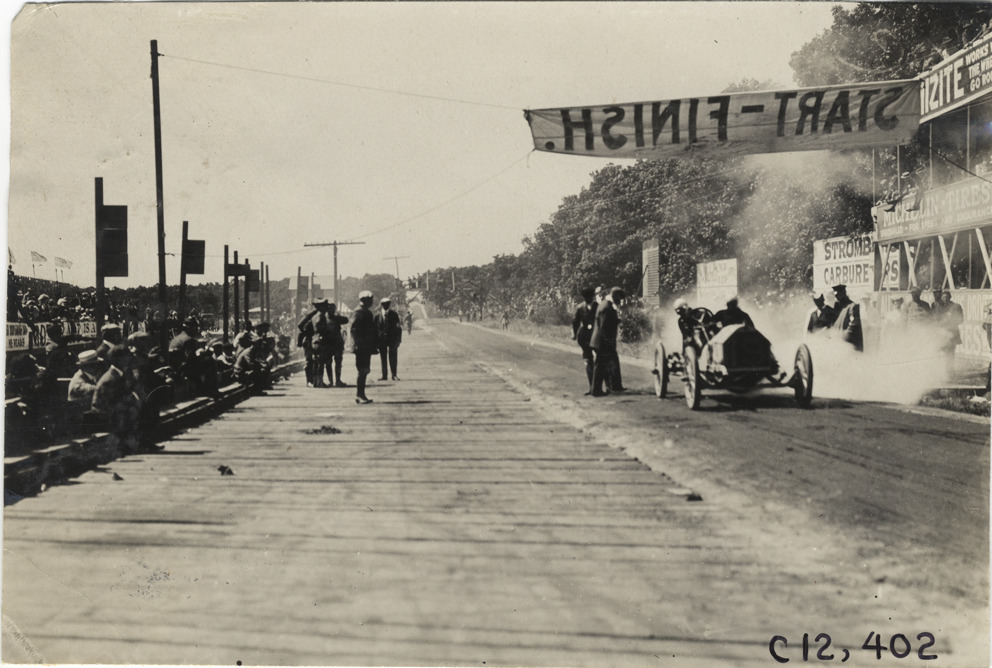Racecar under "Start-Finish" banner, 1909 Crown Point races