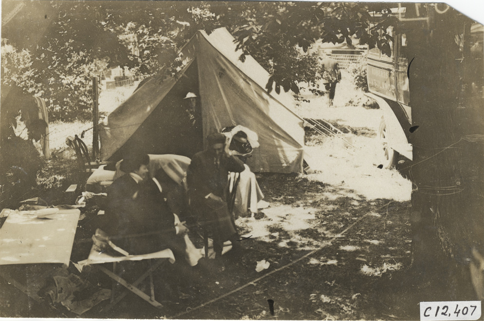View of man and woman sitting on cot in front of tent during the 1909 Crown Point races in Indiana. Man sits in chair; portion of ambulance visible on right. Stamped on back: "Spooner & Wells, Inc., photographers, telephones 3472-3473 Columbus, 1931 Broadway, New York." Handwritten on back: "Races and racing--Crown Point races, 1909."