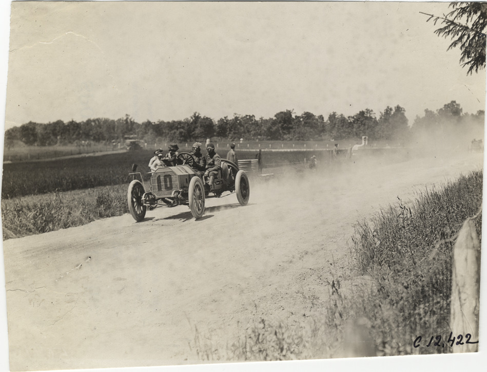 View of driver and passenger racing car no. 10 on course during the 1909 Crown Point races in Indiana. Stamped on back: "Spooner & Wells, Inc., photographers, telephones 3472-3473 Columbus, 1931 Broadway, New York." Handwritten on back: "Races and racing--Crown Point races, 1909."