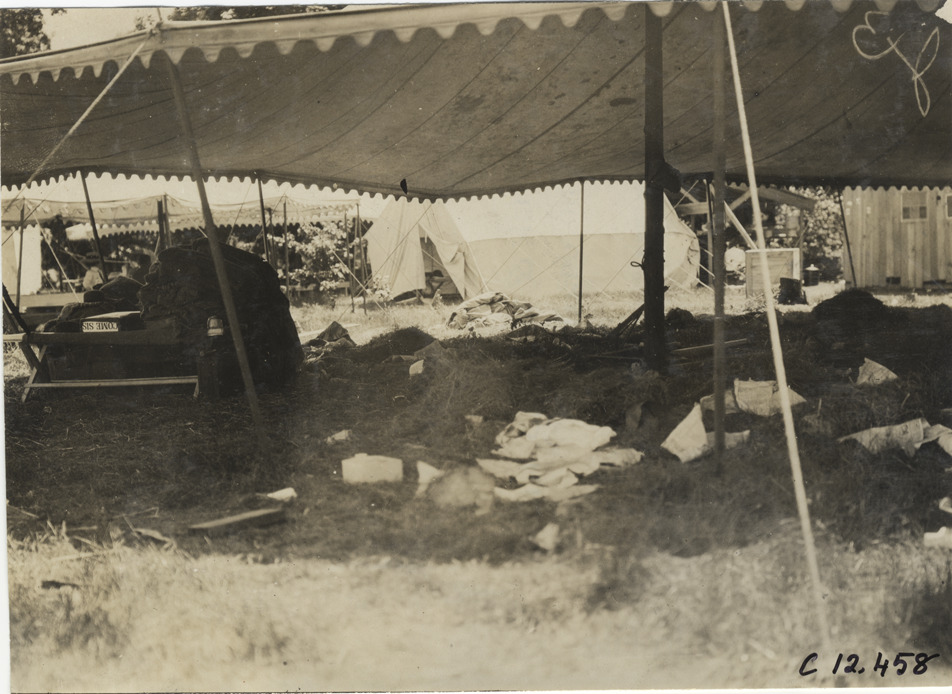 View of debris or litter scattered under tent during the 1909 Crown Point races in Indiana. Stamped on back: "Spooner & Wells, Inc., photographers, telephones 3472-3473 Columbus, 1931 Broadway, New York." Handwritten on back: "Races and racing--Crown Point races, 1909."