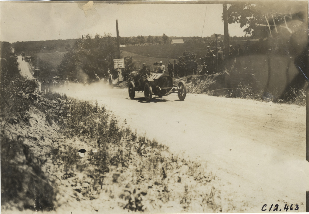 View of driver and passenger racing car on course during the 1909 Crown Point races in Indiana. Spectators watch from roadside. Stamped on back: "Spooner & Wells, Inc., photographers, telephones 3472-3473 Columbus, 1931 Broadway, New York." Handwritten on back: "Races and racing--Crown Point races, 1909." Print is reversed.
