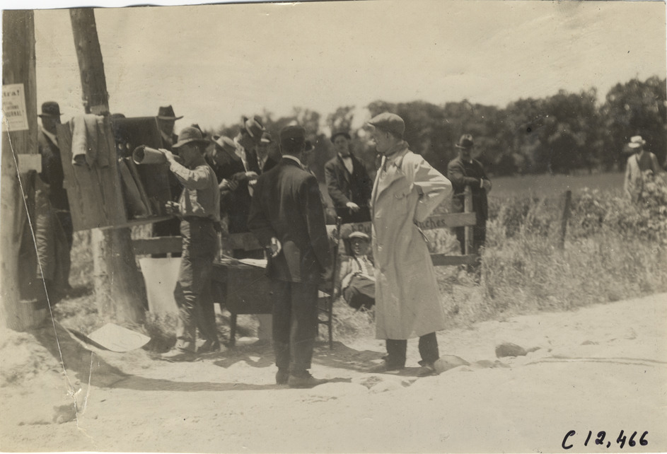 View of group of men standing near telegraph station on roadside, during the 1909 Crown Point races in Indiana. Table and chair are adjacent to fence. Stamped on back: "Spooner & Wells, Inc., photographers, telephones 3472-3473 Columbus, 1931 Broadway, New York." Handwritten on back: "Races and racing--Crown Point races, 1909."