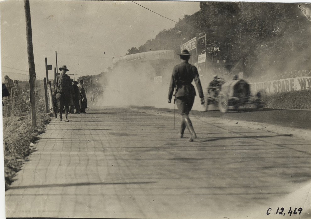 View of two soldiers standing in road near "Start-Finish" banner during the 1909 Crown Point races in Indiana. Car no. 5 on right. Stamped on back: "Spooner & Wells, Inc., photographers, telephones 3472-3473 Columbus, 1931 Broadway, New York." Handwritten on back: "Races and racing--Crown Point races, 1909."
