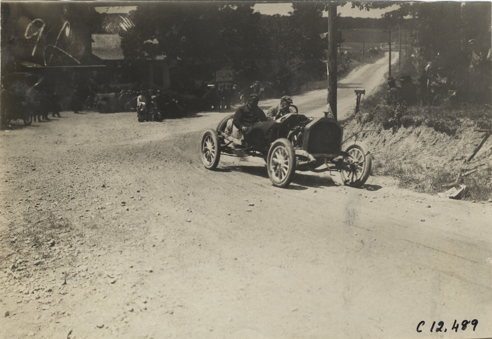 View of driver and passenger racing car on course during the 1909 Crown Point races in Indiana. Stamped on back: "Spooner & Wells, Inc., photographers, telephones 3472-3473 Columbus, 1931 Broadway, New York." Handwritten on back: "Races and racing--Crown Point races, 1909."