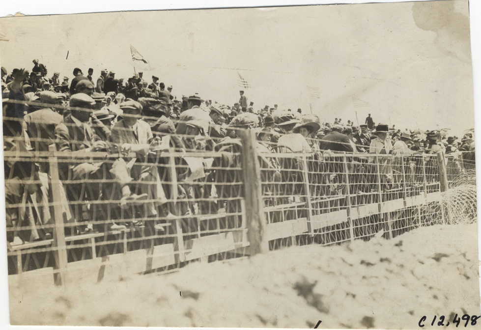 View of crowd of spectators sitting in bleachers during the 1909 Crown Point races in Indiana. Stamped on back: "Spooner & Wells, Inc., photographers, telephones 3472-3473 Columbus, 1931 Broadway, New York." Handwritten on back: "Races and racing--Crown Point races, 1909."