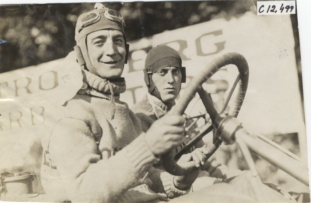 Driver and passenger in racecar, 1909 Crown Point races