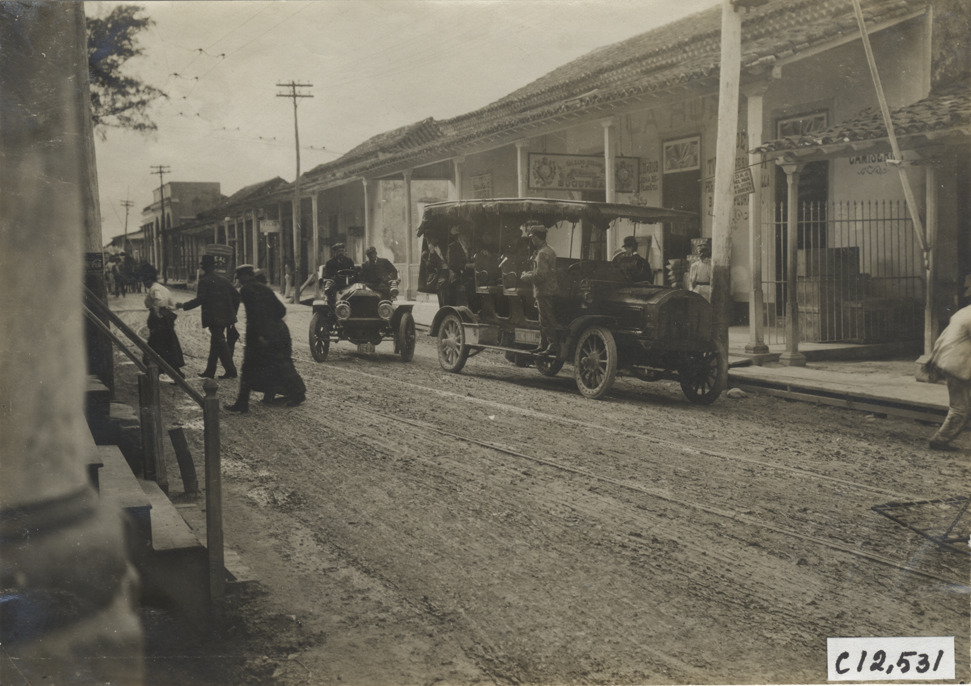 Passengers in vehicles preparing to examine racecourse, 1906 Cuba Road Race
