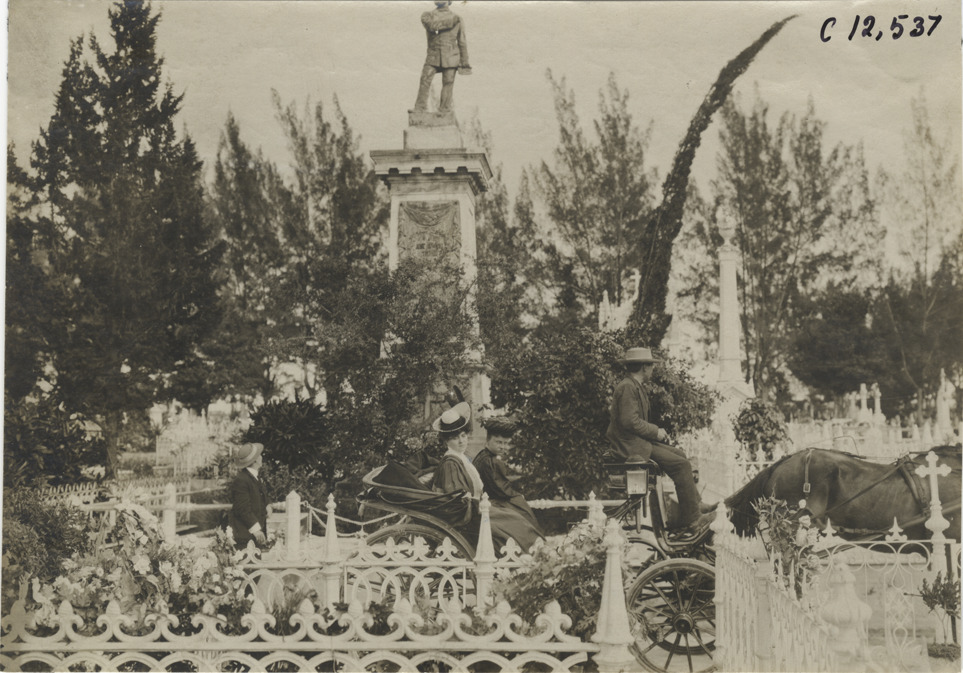 Horse-drawn carriage passing in front of cemetery monument, 1906 Cuba Road Race
