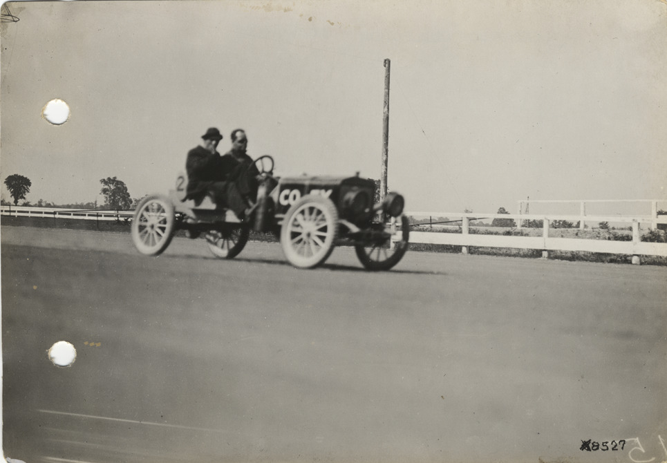 View of Charles Coey and passenger racing a Coey cyclecar during the 1914 Cyclecar races held at the Michigan State Fairgrounds in Detroit. Stamped on back: "Spooner & Wells, Inc., photographers, 1231 Woodward Ave., Detroit, Mich." Handwritten on back: "Chas. Coey in Coey #2, winner of 5-mile race. Cyclecar Race, July '14."