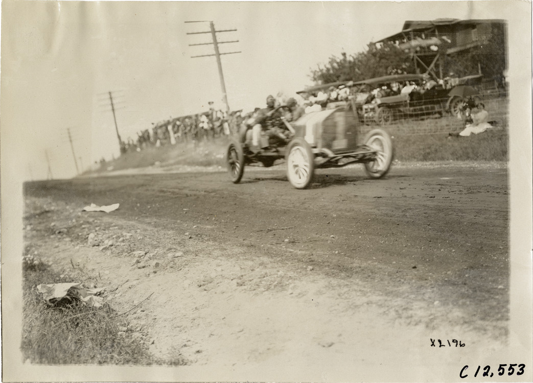 View of driver and passenger racing car no. 1 on course during the 1910 Elgin Races in Illinois. Spectators watch from roadside. Handwritten on back: "Races and racing--Elgin Races, 1910."