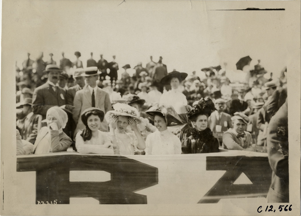 View of several women sitting in bleachers at the 1910 Elgin Races in Illinois. Stamped on back: "Spooner & Wells, Inc., photographers, telephone North 1745. 1231 Woodward Ave., Detroit, Mich. Detroit, 1231 Woodward, New York, 1931 Broadway." Handwritten on back: "Races and racing--Elgin Races, 1910."