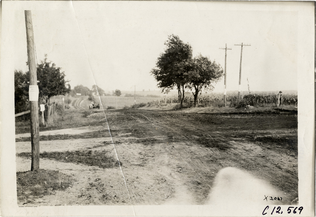 View of section of course in rural area for the 1910 Elgin Races in Illinois. Horse-drawn wagon in distance. Stamped on back: "Spooner & Wells, Inc., photographers, telephone North 1745. 1231 Woodward Ave., Detroit, Mich. Detroit, 1231 Woodward, New York, 1931 Broadway." Handwritten on back: "Races and racing--Elgin Races, 1910."