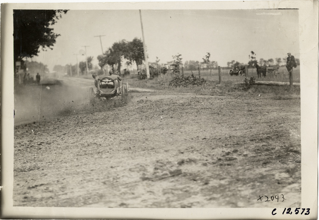 Rear view of Al Livingstone and passenger racing National car on course during the 1910 Elgin Races in Illinois. Stamped on back: "Spooner & Wells, Inc., photographers, telephone North 1745. 1231 Woodward Ave., Detroit, Mich. Detroit, 1231 Woodward, New York, 1931 Broadway." Handwritten on back: "National, A. Livingstone. Races and racing--Elgin Races, 1910."