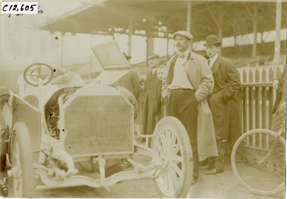 View of group of men and a boy standing next to car with open hood during the 1904 races at the Empire City track in Yonkers, New York. Grandstand in background. Handwritten on back: "Races and racing--Empire City races, 1904."