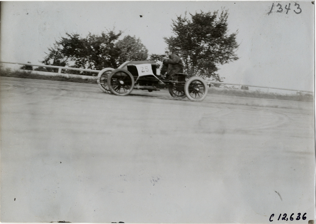 View of driver racing Renault car no. 25 on track during the 1904 races at the Empire City track in Yonkers, New York. Handwritten on back: "Renault. Races and racing--Empire City races, 1904."