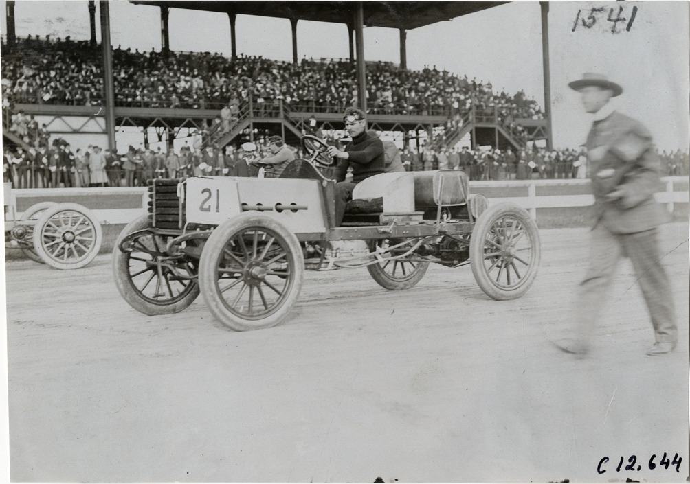 Favorite this☆ Driver in racecar, 1904 Empire City races Description: View of driver posing in car no. 21 on track during the 1904 races at the Empire City track in Yonkers, New York. Man walks in foreground; crowded grandstand in background. Handwritten on back: "Races and racing--Empire City races, 1904." Details Resource ID: na012139 Subject: Automobiles, Racing--New York (State)--Yonkers Automobile racing drivers--New York (State)--Yonkers Automobile racing--New York (State)--Yonkers Photographic prints Date Issued: 1904 Format: 1 photographic print ; 4.75 x 6.75 in. Member of: National Automotive History Collection Lazarnick Collection Filing Location: Races and racing--Empire City races, 1904 #2 Negative Number: Negative #C12,644 Rights: Physical rights are retained by DPL. Copyright is retained in accordance with U.S. copyright laws.
