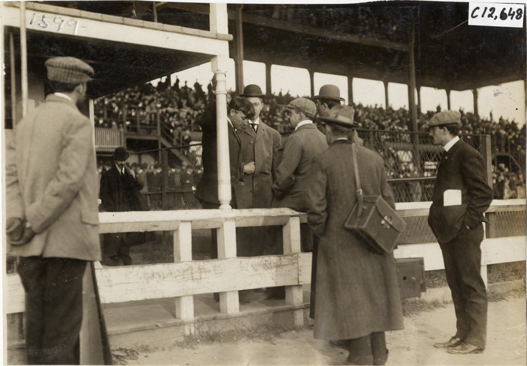 Men standing in front of grandstand, 1904 Empire City races