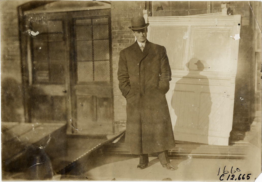 View of a man, wearing an overcoat and hat, during the 1904 races at the Empire City track in Yonkers, New York. Handwritten on back: "Races and racing--Empire City races, 1904."