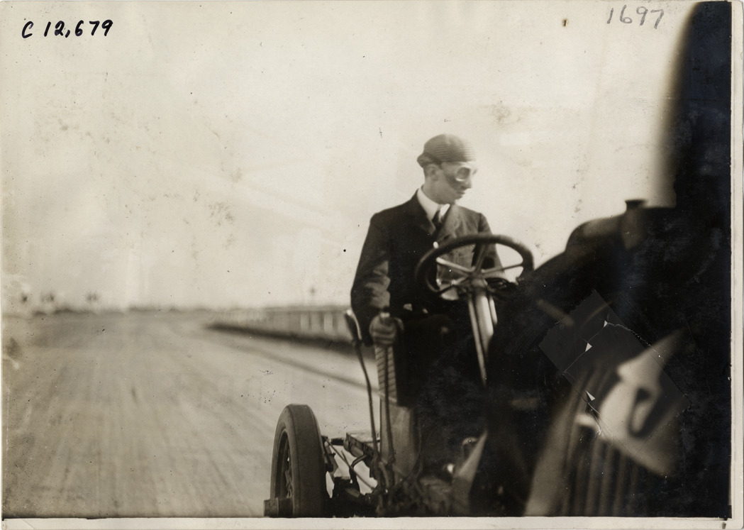 View of driver in car on track during the 1904 races at the Empire City track in Yonkers, New York. Handwritten on back: "Races and racing--Empire City races, 1904."