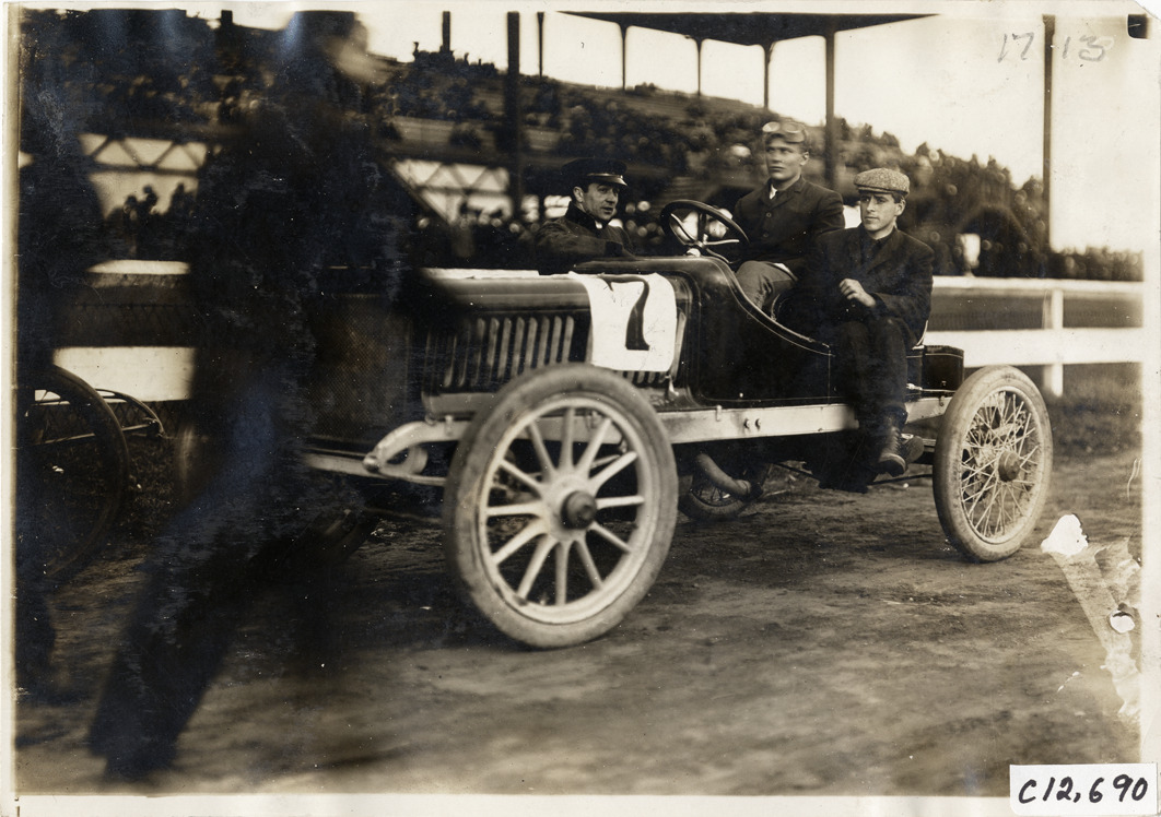 Driver and passenger in racecar, 1904 Empire City races