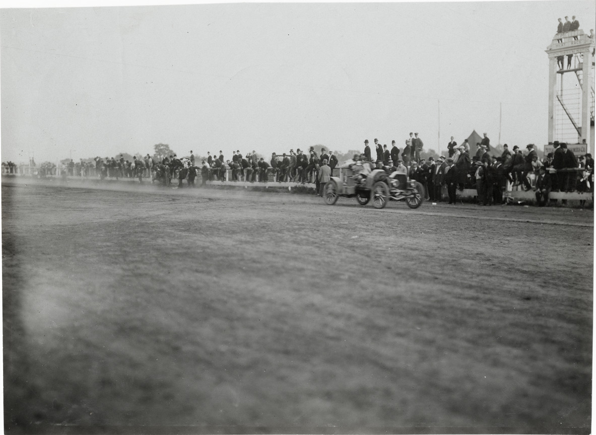 View of spectators watching car on track during the 1906 races at the Empire City track in Yonkers, New York. Stamped on back: "Photo by F. Ed. Spooner, 1536 B'way, telephone 6536-38th St., New York, N.Y." Handwritten on back: "Races and racing--Empire City races, 1906."
