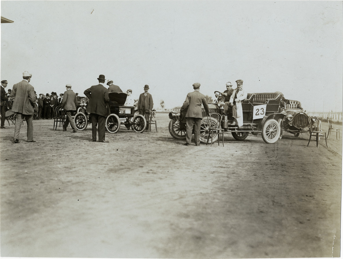 View of motorists driving cars through obstacle course of chairs in an obstacle race at the Empire City track in Yonkers, New York. Officials stand near cars on track; spectators in background. Stamped on back: "Photo by F. Ed. Spooner, 1536 B'way, telephone 6536-38th St., New York, N.Y." Handwritten on back: "Races and racing--Empire City races, 1906."