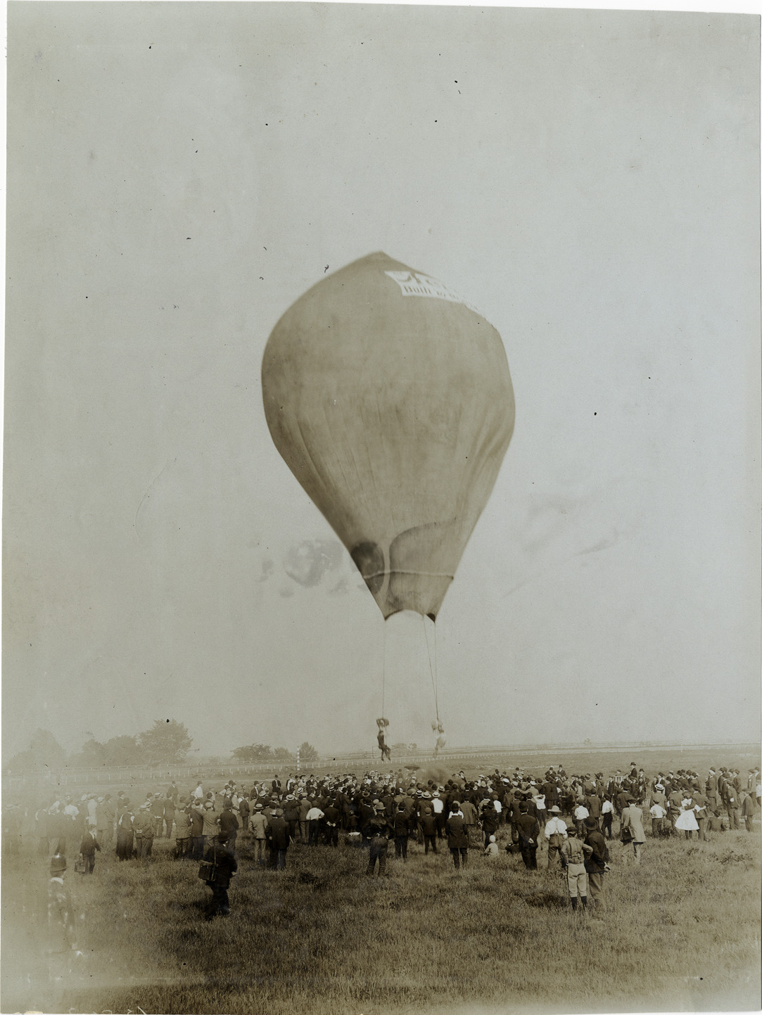 View of crowd watching hot air balloon ascent in field during events held at the Empire City track in Yonkers, New York. Two parachutists rides trapezes suspended from balloon. Stamped on back: "Photo by F. Ed. Spooner, 1536 B'way, telephone 6536-38th St., New York, N.Y." Handwritten on back: "Balloon. Races and racing--Empire City races, 1906."