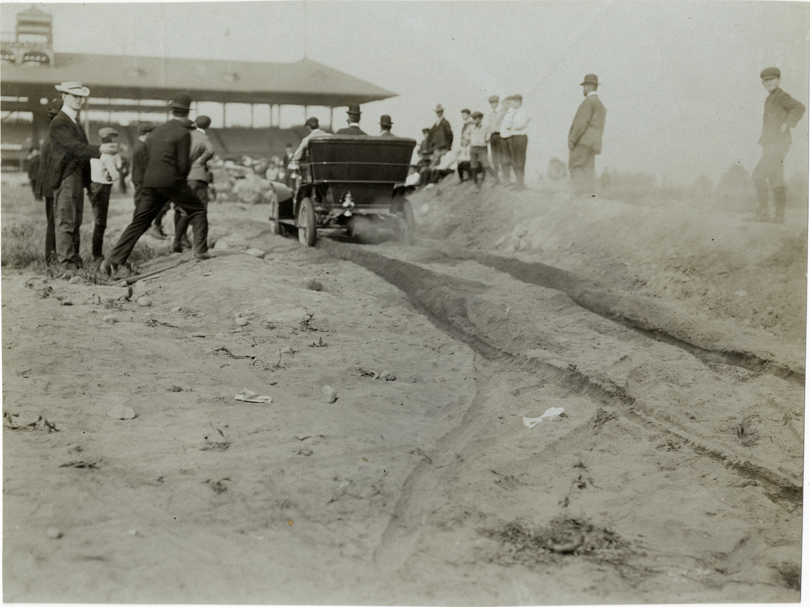 Rear view of motorists driving car through sand pit in a power test during the 1906 races at the Empire City track in Yonkers, New York. Spectators stand on sidelines; grandstand in background. Stamped on back: "Photo by F. Ed. Spooner, 1536 B'way, telephone 6536-38th St., New York, N.Y." Handwritten on back: "Races and racing--Empire City races, 1906."