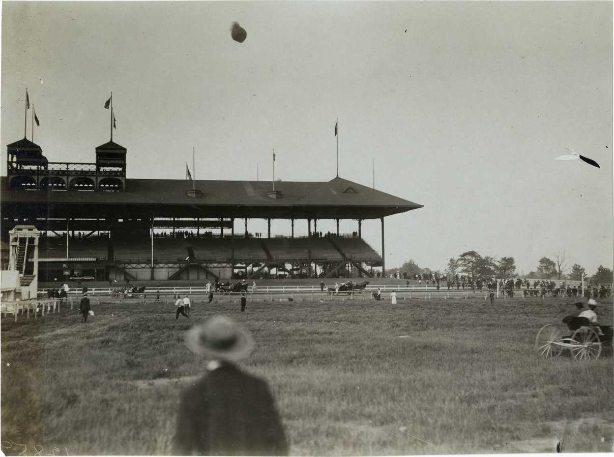 Distant view of grandstand during the 1906 races at the Empire City track in Yonkers, New York. Field in foreground. Stamped on back: "Photo by F. Ed. Spooner, 1536 B'way, telephone 6536-38th St., New York, N.Y." Handwritten on back: "Races and racing--Empire City races, 1906."