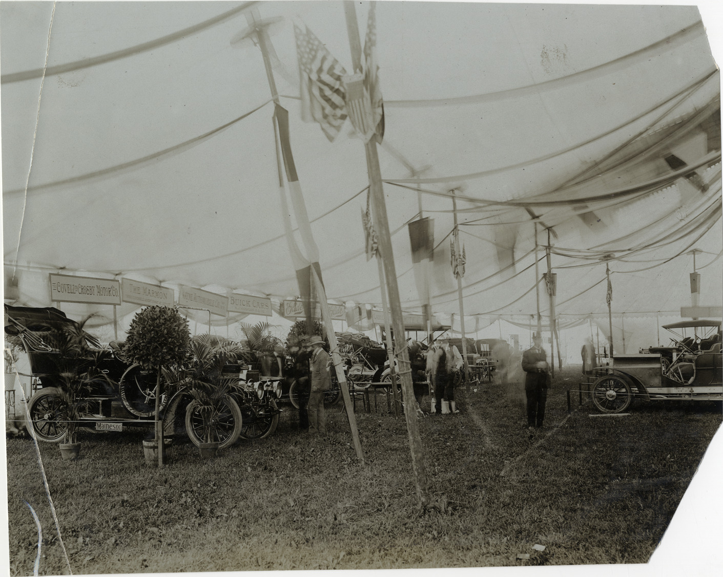 Automobiles displayed under tent for open-air automobile show, 1906 Empire City races