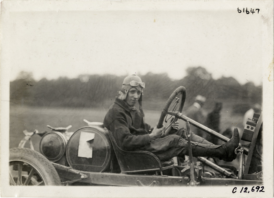 Close-up view of driver posing in racecar during the 1910 races at the Empire City track in Yonkers, New York. Stamped on back: "Spooner & Wells, Inc., photographers, telephones 3472-3473 Columbus, 1931 Broadway, New York." Handwritten on back: "Races and racing--Empire City races, 1910."
