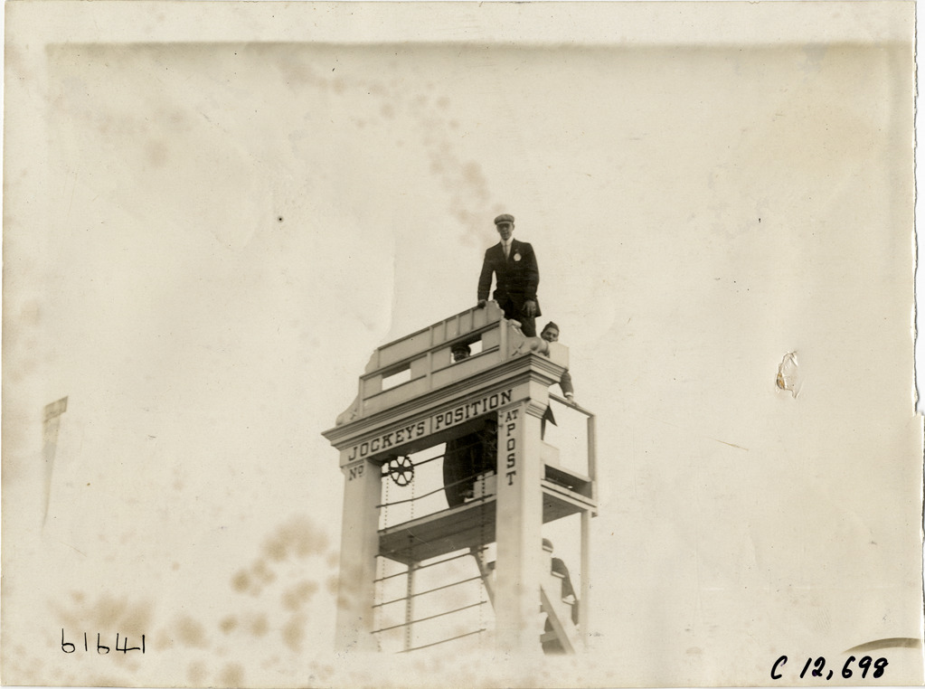 View of men standing atop scoreboard during the 1910 races at the Empire City track in Yonkers, New York. Painted on structure: "Jockeys position, no., at post." Stamped on back: "Spooner & Wells, Inc., photographers, telephones 3472-3473 Columbus, 1931 Broadway, New York." Handwritten on back: "Races and racing--Empire City races, 1910."
