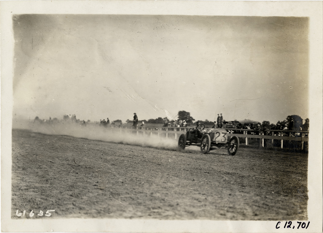 View of driver racing car no. 23 on track during the 1910 races at the Empire City track in Yonkers, New York. Stamped on back: "Spooner & Wells, Inc., photographers, telephones 3472-3473 Columbus, 1931 Broadway, New York." Handwritten on back: "Races and racing--Empire City races, 1910."