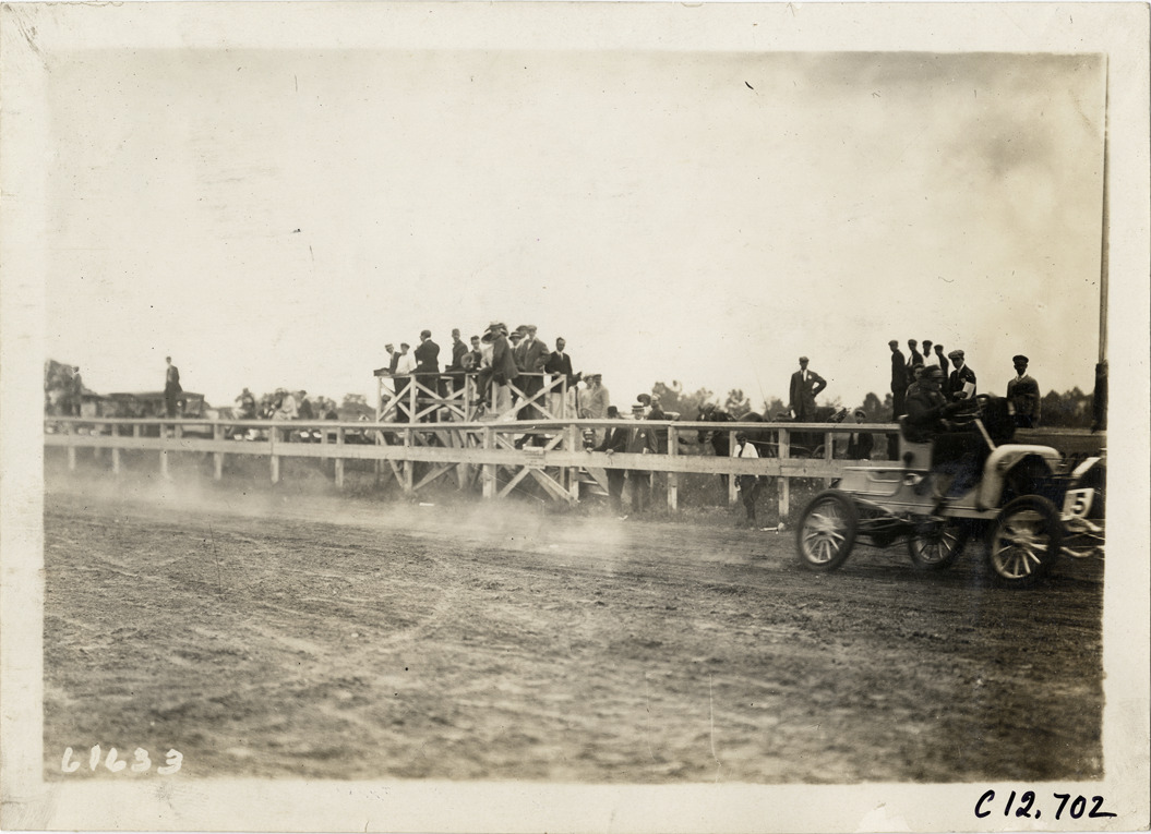 View of driver racing car no. 5 on track during the 1910 races at the Empire City track in Yonkers, New York. Spectators stand on small platform on side of track. Stamped on back: "Spooner & Wells, Inc., photographers, telephones 3472-3473 Columbus, 1931 Broadway, New York." Handwritten on back: "Races and racing--Empire City races, 1910."