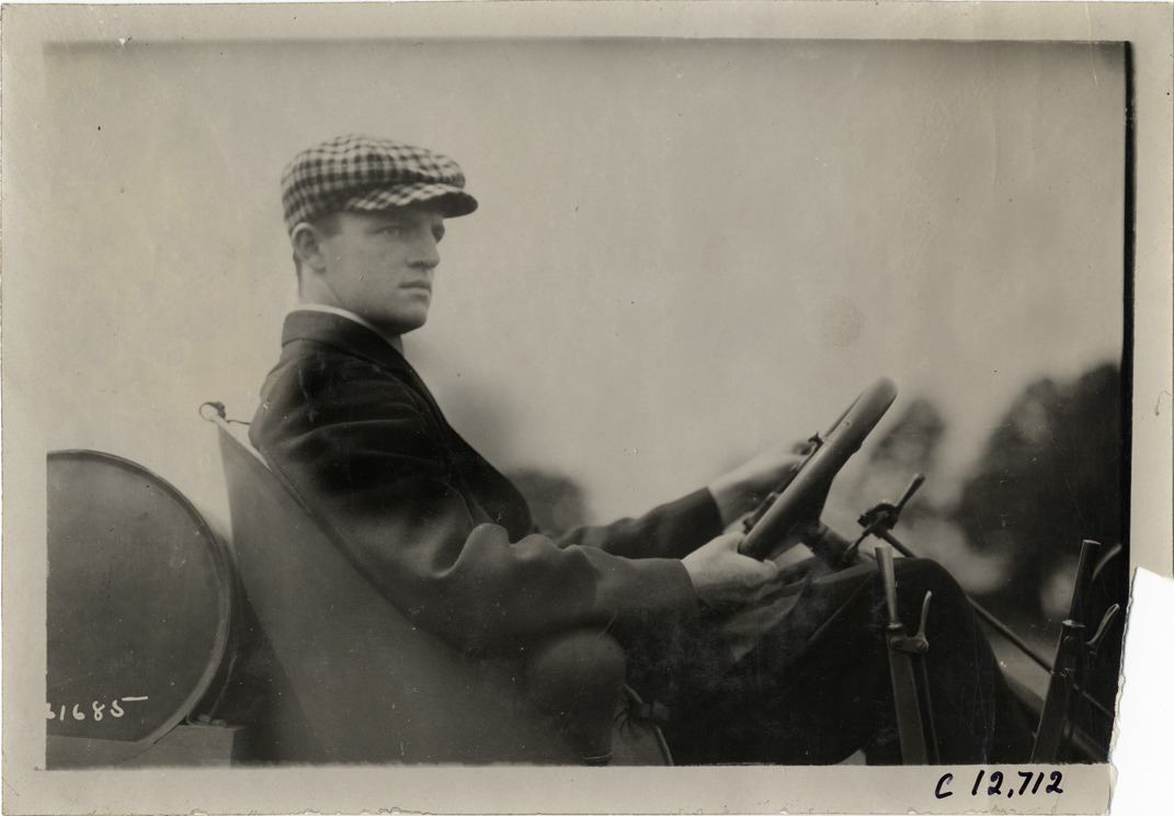 Close-up view of driver posing in racecar during the 1910 races at the Empire City track in Yonkers, New York. Stamped on back: "Spooner & Wells, Inc., photographers, telephones 3472-3473 Columbus, 1931 Broadway, New York." Handwritten on back: "Races and racing--Empire City races, 1910."