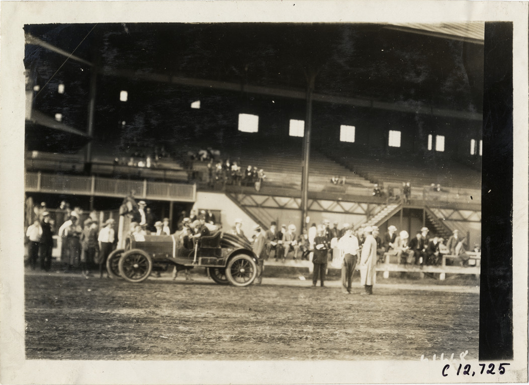 View of driver and passenger in car during the 1910 races at the Empire City track in Yonkers, New York. Racing officials and policeman stand on right; grandstand in background. Stamped on back: "Spooner & Wells, Inc., photographers, telephones 3472-3473 Columbus, 1931 Broadway, New York." Handwritten on back: "Races and racing--Empire City races, 1910."
