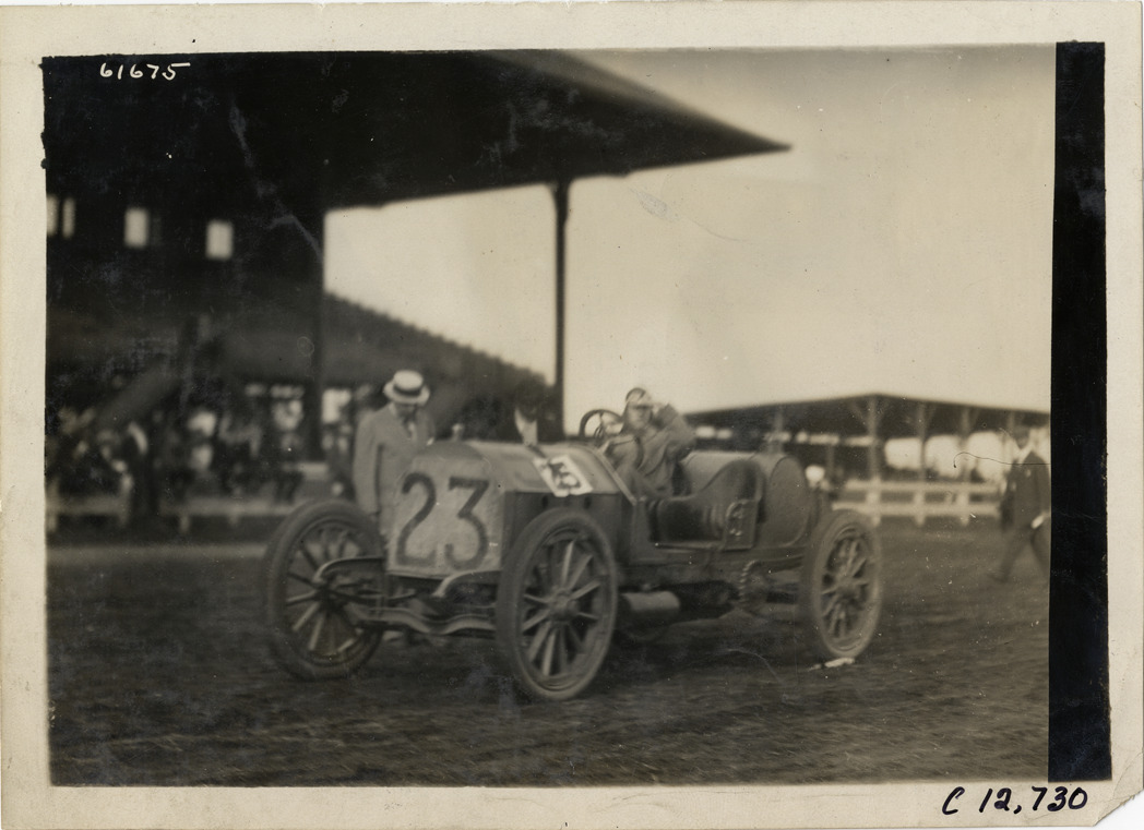 View of driver in car no. 23 during the 1910 races at the Empire City track in Yonkers, New York. Grandstand in background. Stamped on back: "Spooner & Wells, Inc., photographers, telephones 3472-3473 Columbus, 1931 Broadway, New York." Handwritten on back: "Races and racing--Empire City races, 1910."