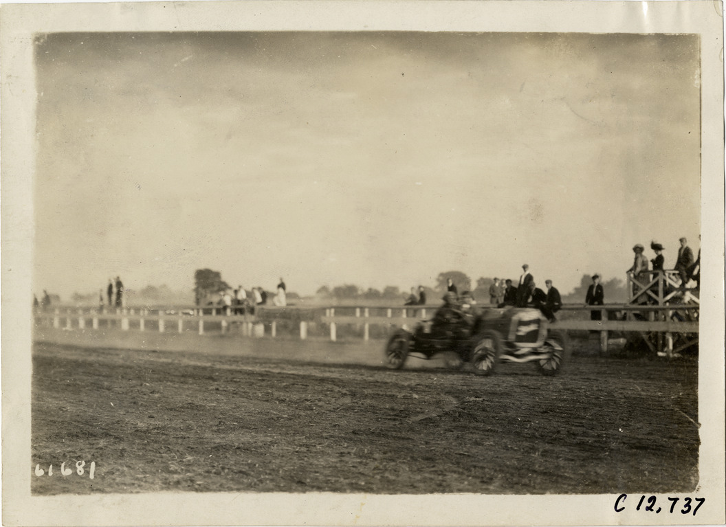 View of driver and passenger racing Buick car on track during the 1910 races at the Empire City track in Yonkers, New York. Stamped on back: "Spooner & Wells, Inc., photographers, telephones 3472-3473 Columbus, 1931 Broadway, New York." Handwritten on back: "Races and racing--Empire City races, 1910."