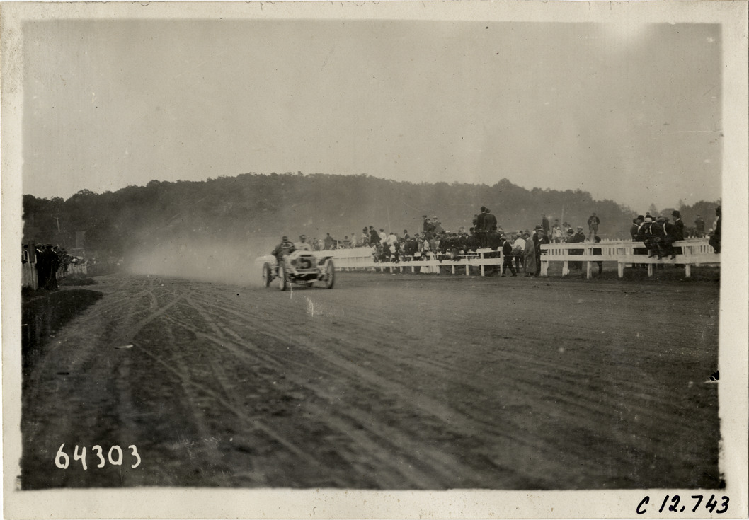 View of driver and passenger racing car no. 5 on track during the 1910 races at the Empire City track in Yonkers, New York. Spectators in background. Stamped on back: "Spooner & Wells, Inc., photographers, telephones 3472-3473 Columbus, 1931 Broadway, New York." Handwritten on back: "Races and racing--Empire City races, 1910."