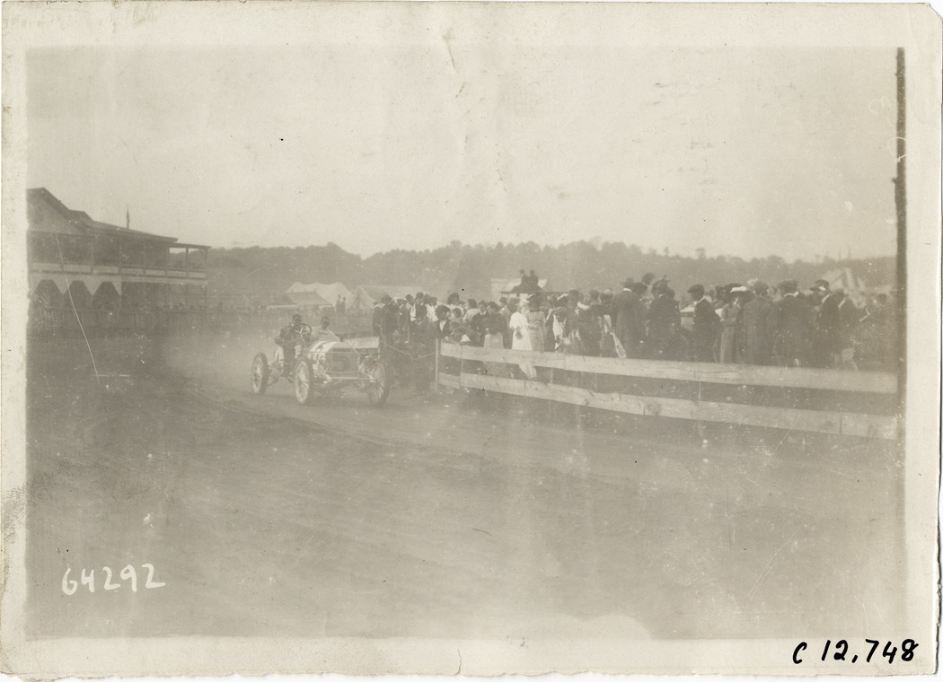 View of driver and passenger racing car no. 5 on track during the 1910 races at the Empire City track in Yonkers, New York. Crowd of spectators stand behind railing. Stamped on back: "Spooner & Wells, Inc., photographers, telephones 3472-3473 Columbus, 1931 Broadway, New York." Handwritten on back: "Rutherford [?], 3rd race. Races and racing--Empire City races, 1910."