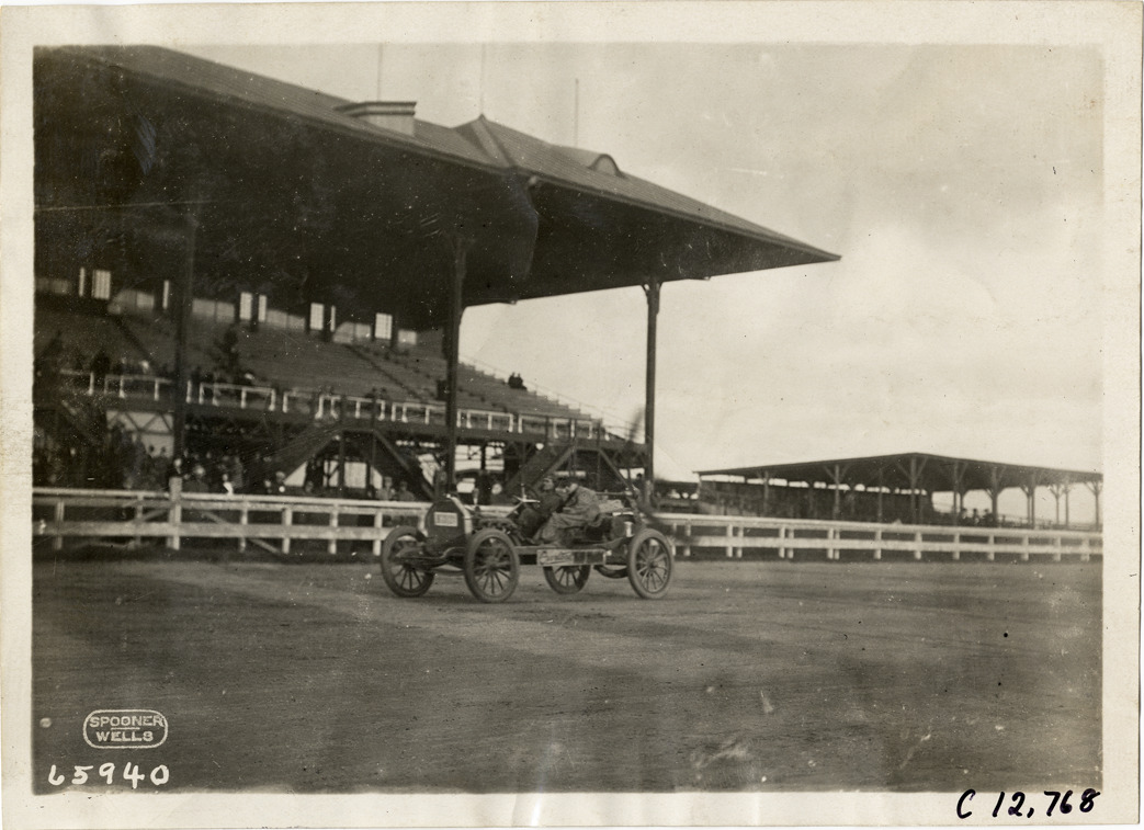 View of driver and passenger in Overland wind wagon during the 1910 races at the Empire City track in Yonkers, New York. Grandstand in background. Printed on front: "Spooner, Wells." Stamped on back: "Spooner & Wells, Inc., photographers, telephones 3472-3473 Columbus, 1931 Broadway, New York." Handwritten on back: "Races and racing--Empire City races, 1910."