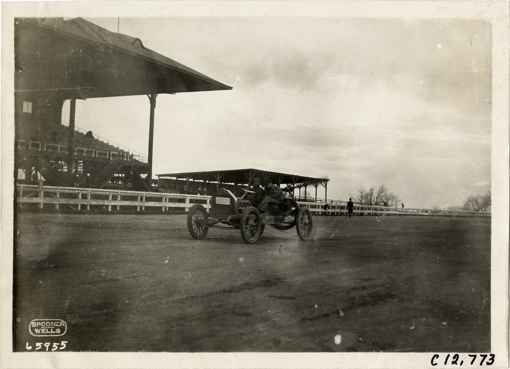 View of driver and passenger in Overland wind wagon during the 1910 races at the Empire City track in Yonkers, New York. Grandstand in background. Printed on front: "Spooner, Wells." Stamped on back: "Spooner & Wells, Inc., photographers, telephones 3472-3473 Columbus, 1931 Broadway, New York." Handwritten on back: "Races and racing--Empire City races, 1910."