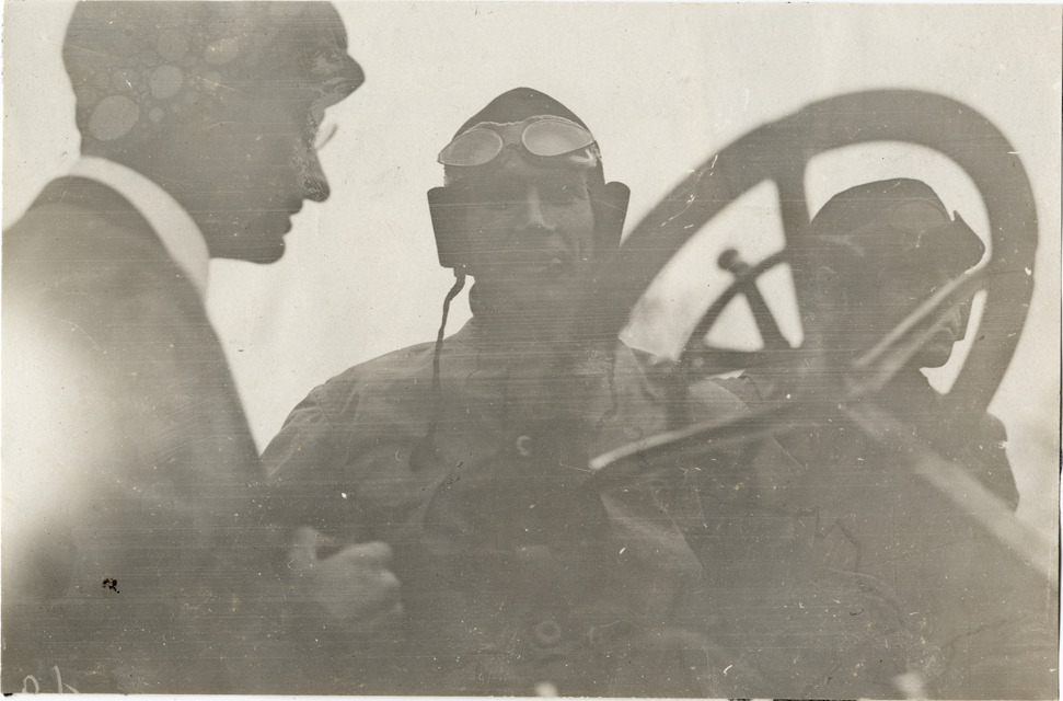 Close-up view of man speaking with driver in car during the 1908 Fairmount Park races in Philadelphia, Pennsylvania. Handwritten on back: "Races and racing--Fairmount Park races, 1908."