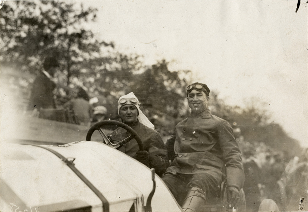 Close-up view of George Salzman and Winters in Thomas car during the 1908 Fairmount Park races in Philadelphia, Pennsylvania. Handwritten on back: "Salzman & Winters, Thomas. Races and racing--Fairmount Park races, 1908."