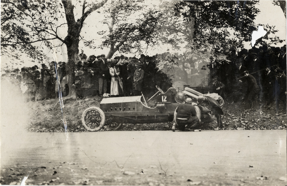 View of driver and passenger changing tire on Palmer-Singer car no. 12 during the 1908 Fairmount Park races in Philadelphia, Pennsylvania. Crowd of spectators stand on roadside in background. Stamped on back: "Spooner and Wells, 1931 Broadway, New York, duplicates any time, enlargements all sizes, tel. 3472-3473 Col., credit appreciated." Handwritten on back: "Palmer Singer. Races and racing--Fairmount Park races, 1908."